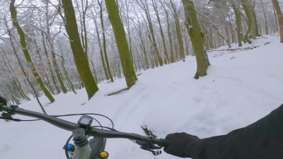 Im Schnee radlfahren auf den legalen Trails am Steyregger Pfenningberg.