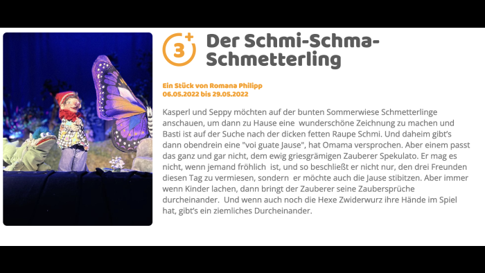 Am 18. May. 2022 | 15:00 Uhr Der Schmi-Schma-Schmetterling Created at 16. May. 2022 by dorf BeschreibungEmbed Ein Stück von Romana Philipp 06.05.2022 bis 29.05.2022 Kasperl und Seppy möchten auf der bunten Sommerwiese Schmetterlinge anschauen, um dann zu Hause eine wunderschöne Zeichnung zu machen und Basti ist auf der Suche nach der dicken fetten Raupe Schmi. Und daheim gibt’s dann obendrein eine "voi guate Jause", hat Omama versprochen. Aber einem passt das ganz und gar nicht, dem ewig griesgrämigen Zauberer Spekulato. Er mag es nicht, wenn jemand fröhlich ist, und so beschließt er nicht nur, den drei Freunden diesen Tag zu vermiesen, sondern er möchte auch die Jause stibitzen. Aber immer wenn Kinder lachen, dann bringt der Zauberer seine Zaubersprüche durcheinander. Und wenn auch noch die Hexe Zwiderwurz ihre Hände im Spiel hat, gibt’s ein ziemliches Durcheinander. Share & Embed Embed this Video Link to this Video Add new comment Kommentar verfassen login or register to post comments. Linzer Puppentheater 35 Videos, 2 Members #Tags More from Channel 00:08:39 Basti, der kleine grüne Drache, möchte Omama zum Geburtstag einen Schatz aus seiner Drachenschätz Linzer Puppentheater spielt: Die Drachenschätze in der Eishö Linzer Puppentheater since 5 years 11 months 00:03:04 Der kleine grüne Drache Basti wünscht sich zu seinem Geburtstag nichts so sehr wie einen Luftball Linzer Puppentheater spielt: Der verzauberte Luftballon Linzer Puppentheater since 5 years 10 months Die Mäuseprinzessin hat endlich ihren Mäuseprinzen gefunden und es soll Hochzeit gefeiert we Die verzauberte Mäuseprinzessin Linzer Puppentheater since 3 years 11 months ein Stück von Christa Koinig Seppy und das goldene Buch Linzer Puppentheater since 3 years 8 months Ein Stück von Romana Philipp 06.05.2022 bis 29.05.2022 Der Schmi-Schma-Schmetterling Linzer Puppentheater since 3 years 7 months 00:49:05 Livestream am 20.11.2023 um 15:00 Uhr Seppy und der freche Bücherwurm Linzer Puppentheater since 2 years 1 month Live am 24.11.2023 um 15:00 Uhr Wulliwu der Teddybär Wulliwu der Teddybär Linzer Puppentheater since 2 years 00:42:24 Live aus dem Linzer Puppentheater Seppy und das graue Wuschelding Linzer Puppentheater since 2 years 11 months Das neue Drachenwirtshaus Das neue Drachenwirtshaus Linzer Puppentheater since 1 year 6 months 00:43:57 Kasperl und Seppy haben in Omamas Holzschuppen eine Futterkrippe gefunden und bringen sie in den Die geheimnisvolle Futterkrippe Linzer Puppentheater since 1 year 12 months 00:49:20 Ein Stück von Christa Koinig Ein gar seltsamer Schmetterling Linzer Puppentheater since 2 years 6 months 00:42:05 Ein Stück von Christa Koinig 14.09.2022 bis 02.10.2022 Der kleine Drache Flülipi Linzer Puppentheater since 3 years 2 months Mehr vom User 01:18:15 Das Frauenbüro der Stadt Linz war eines der ersten in Österreich und wurde 1992 gegründet. 30 Jahre Frauenbüro Frauenbüro Linz since 3 years 4 months 00:59:49 Wir alle konsumieren und produzieren Abfall. Das lässt sich gar nicht vermeiden. Abfallmanagemant Klima und Du since 3 years 4 months 00:10:13 Debütkonzert des Ensembles Lizard - Linzer Ensemble für aktuelle Musik Con moto | Gerald Resch | Lizard Ensemble Anton Bruckner Privatuniversität OÖ since 3 years 4 months 00:09:27 Debütkonzert des Ensembles Lizard - Linzer Ensemble für aktuelle Musik Aun a Laus / Irene Kepl / Lizard Ensemble Anton Bruckner Privatuniversität OÖ since 3 years 4 months Der Live-Stream ist in Real-Time und nach Konzertende nicht mehr abrufbar. Porgy Live: Steve Hackett & Djabe Porgy and Bess Livestreams since 3 years 4 months Der Live-Stream ist in Real-Time und nach Konzertende nicht mehr abrufbar. Porgy live: Orchestra Baobab (SEN) Porgy and Bess Livestreams since 3 years 4 months 00:00:22 schneller Handy Upload Georg pocketTV since 3 years 4 months 00:56:10 Rück-V die März Retrokicktive im April mit Peter Huliak | FC Blau-Weiß Linz Rück-V: mit Peter Huliak | FC Blau-Weiß Linz V-TV since 3 years 4 months 01:01:14 Klima und Du Was können wir Konsument*innen zur Bewältigung der Klimakrise beitragen? Gegen Verschwendung! Für Energiegrundsicherung! Klima und Du since 3 years 4 months 00:55:42 Studiogast Andi Gahleitner Live gesendet am 3. Oktober 2022 Rück-V | Die große September-Retrokicktive FC Blau-Weiß Linz V-TV since 3 years 2 months Tagung Kritische Medienkompetenz 2022 Bildung - Medien - Demokratie DORFTV. link since 3 years 2 months More like this 00:47:46 Kasperl und Seppy möchten auf der bunten Sommerwiese Schmetterlinge anschauen Der Schmi-Schma-Schmetterling Linzer Puppentheater since 3 years 7 months 00:49:20 Ein Stück von Christa Koinig Ein gar seltsamer Schmetterling Linzer Puppentheater since 2 years 6 months 00:03:04 Der kleine grüne Drache Basti wünscht sich zu seinem Geburtstag nichts so sehr wie einen Luftball Linzer Puppentheater spielt: Der verzauberte Luftballon Linzer Puppentheater since 5 years 10 months 00:50:18 Der verzauberte Maikäfer Ein Stück von Christa Koinig Der verzauberte Maikäfer Linzer Puppentheater since 2 years 6 months 00:45:49 „Kasperl und der Mäusekönig“Linzer Puppentheater Seppy und das goldene Buch Linzer Puppentheater since 3 years 8 months 00:46:42 „Kasperl und der Mäusekönig“ Linzer Puppentheater Kasperl und der Mäusekönig Linzer Puppentheater since 4 years 00:42:24 Live aus dem Linzer Puppentheater Seppy und das graue Wuschelding Linzer Puppentheater since 2 years 11 months 00:46:09 Der uralte Drachenopapa hat dem kleinen grünen Drachen Basti ein geheimnisvolles Drachenzauberwor Kasperl und das Drachenzauberwort Linzer Puppentheater since 9 months 00:51:19 Der Specht hat sein buntestes Federkleid angelegt, die Schmetterlinge haben einen Tanz einstudier Frühlingsfest im Zauberwald Linzer Puppentheater since 2 years 8 months 00:42:05 Ein Stück von Christa Koinig 14.09.2022 bis 02.10.2022 Der kleine Drache Flülipi Linzer Puppentheater since 3 years 2 month
