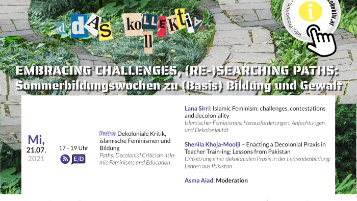 + Dieses Video kann nicht On Demand im Web zur Verfügung gestellt werden. Dekoloniale Kritik, islamische Feminismen und Bildung - Sommerbildungswochen zu (Basis)Bildung und Gewalt Created at 24. Mar. 2026 by das kollektiv BeschreibungEmbed Embracing challenges, (re-)searching paths: Sommerbildungswochen zu (Basis)Bildung und Gewalt. Mittwoch, 14.07.2021 Paths: Dekoloniale Kritik, islamische Feminismen und Bildung. Lana Sirri, Shenila Khoja-Moolji, Asma Aiad Lana Sirri Dr. Lana Sirri is an assistant professor in Gender and Religion at the Centre for Gender and Diversity (CGD) at Maastricht University, the Netherlands. She completed her Ph.D. studies at the Centre for Transdisciplinary Gender Studies at the Humboldt University of Berlin in 2017. Her research lies at the intersection of religion and gender and critically explores Islamic feminist thought, emphasizing its historical development and its diverse theoretical frameworks and methodologies. Lana has published articles on the topic of Islamic feminism and Muslim feminist thought. She also completed a book titled “Einführung in den Islamischen Feminismus” (2017, 2020) which introduces Islamic feminism to a non-academic audience of German-speaking activists. Lana is an associated expert of the Centre for Intersectional Justice and is a co-founder of the Berlin Muslim Feminist Group and the Black and PoC Academic Network in Germany. Islamic Feminism: challenges, contestations and decoloniality.Islamischer Feminismus: Herausforderungen, Anfechtungen und DekolonialitätIslamic feminism is a field of study that has been marginalized both in contemporary Islamic discourse and in feminist discourse. This lecture counters this marginalization by presenting the diversity of approaches used in Islamic feminist scholarship. It takes a decolonial intersectional perspective to examine the different strategies Muslim and Islamic feminists have developed to challenge constellations of power, such as sexism, religious extremism, and the growing anti-Muslim racism in Europe. Shenila Khoja-Moolji Prof. Dr. Shenila Khoja-Moolji is Assistant Professor of Gender, Sexuality, and Women’s Studies at Bowdoin College. She is an interdisciplinary scholar working at the intersections of feminist theory, cultural studies, and Islamic studies. Her research interests include, Muslim girlhood(s), masculinities and sovereignty, and Ismaili Muslim women's history. She investigates these topics empirically in relation to Muslims in Pakistan, the United States, and Canada. Professor Khoja-Moolji is the author of award-winning book, "Forging the Ideal Educated Girl: The Production of Desirable Subjects in Muslim South Asia". The book combines historical and cultural studies analyses with ethnographic work to examine the figure of the ‘educated girl’ in colonial India and postcolonial Pakistan. Enacting a Decolonial Praxis in Teacher Training: Lessons from Pakistan.Umsetzung einer dekolonialen Praxis in der Lehrendenbildung: Lehren aus Pakistan Focusing on a specific case of teacher professional development workshops in Pakistan, and drawing on the methodology of narrative inquiry, in this talk Professor Khoja-Moolji outlines some of the pedagogical (re)encounters that she created to reclaim local knowledge ecologies. It entailed examining the current moment of coloniality; an active reengagement with local landscapes, intellectual productions, and teacher selves; and, becoming hunarmand (skillful) in taking up, twisting, and molding dominant pedagogical models toward anti- and decolonial ends. Asma Aiad (Moderation) Asma Aiad ist Künstlerin, Aktivistin, Jugendarbeiterin & Sprecherin des Black Voices Volksbegehren. Ihren Bachelor absolvierte sie in Politikwissenschaft. Zurzeit studiert sie an der Akademie für bildende Künste und schließt ihren Master in Gender Studies mit dem Schwerpunkt Islamischer Feminismus ab. In ihrer aktivistischen und künstlerischen Arbeit beschäftigt sie sich mit Antirassismus, Feminismus und der Dekonstruktion von Stereotypen. Mehr Information über das Projekt Share & Embed Embed this Video Link to this Video Add new comment Kommentar verfassen login or register to post comments. das kollektiv 3 Videos, 1 Members #Tags Transkription 48130_original.txt 48130_original.webvtt More from Channel 02:00:31 Embracing challenges, (re-)searching paths: Sommerbildungswochen zu (Basis)Bildung und Gewalt. Antikoloniale feministische Solidaritäten - Sommerbildungswo das kollektiv since 20 hours 10 min 01:36:43 Embracing challenges, (re-)searching paths: Sommerbildungswochen zu (Basis)Bildung und Gewalt. Rassismuskritik und antirassistische Kämpfe in der feministi das kollektiv since 4 hours 17 min 01:37:20 Embracing challenges, (re-)searching paths: Sommerbildungswochen zu (Basis)Bildung und Gewalt. Dekoloniale Kritik, islamische Feminismen und Bildung - Somm das kollektiv since 2 hours 43 min Mehr vom User 02:00:31 Embracing challenges, (re-)searching paths: Sommerbildungswochen zu (Basis)Bildung und Gewalt. Antikoloniale feministische Solidaritäten - Sommerbildungswo das kollektiv since 20 hours 10 min 01:36:43 Embracing challenges, (re-)searching paths: Sommerbildungswochen zu (Basis)Bildung und Gewalt. Rassismuskritik und antirassistische Kämpfe in der feministi das kollektiv since 4 hours 17 min 01:37:20 Embracing challenges, (re-)searching paths: Sommerbildungswochen zu (Basis)Bildung und Gewalt. Dekoloniale Kritik, islamische Feminismen und Bildung - Somm das kollektiv since 2 hours 43 min More like this 01:40:58 Alexia Achilleos and Iyo Bisseck explore the impact of technology on power and control structures Lecture & Talk with Iyo Bisseck, Alexia Achilleos Kunstuni / Live since 1 year 3 months 01:53:05 Keylecture by Elena Knox (AU) Incl. Feminist AI lecture series: Keylecture by Elena Knox Incl. d FIF TV since 2 years 5 months 00:12:01 The most famous critique of social distancing started in anthropologycircles once we had off